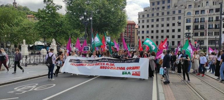 Las trabajadoras del comercio textil, general y piel y calzado han vuelto a salir hoy a la calle con éxito para exigir condiciones de trabajo dignas y la retirada de los elementos regresivos de la propuesta patronal. Con una nueva jornada de huelga convocada por ELA y LAB, las trabajadoras se han manifestado hoy en Bilbao, partiendo desde el Arriaga hasta la sede de CEBEK, donde han realizado una sentada ruidosa.