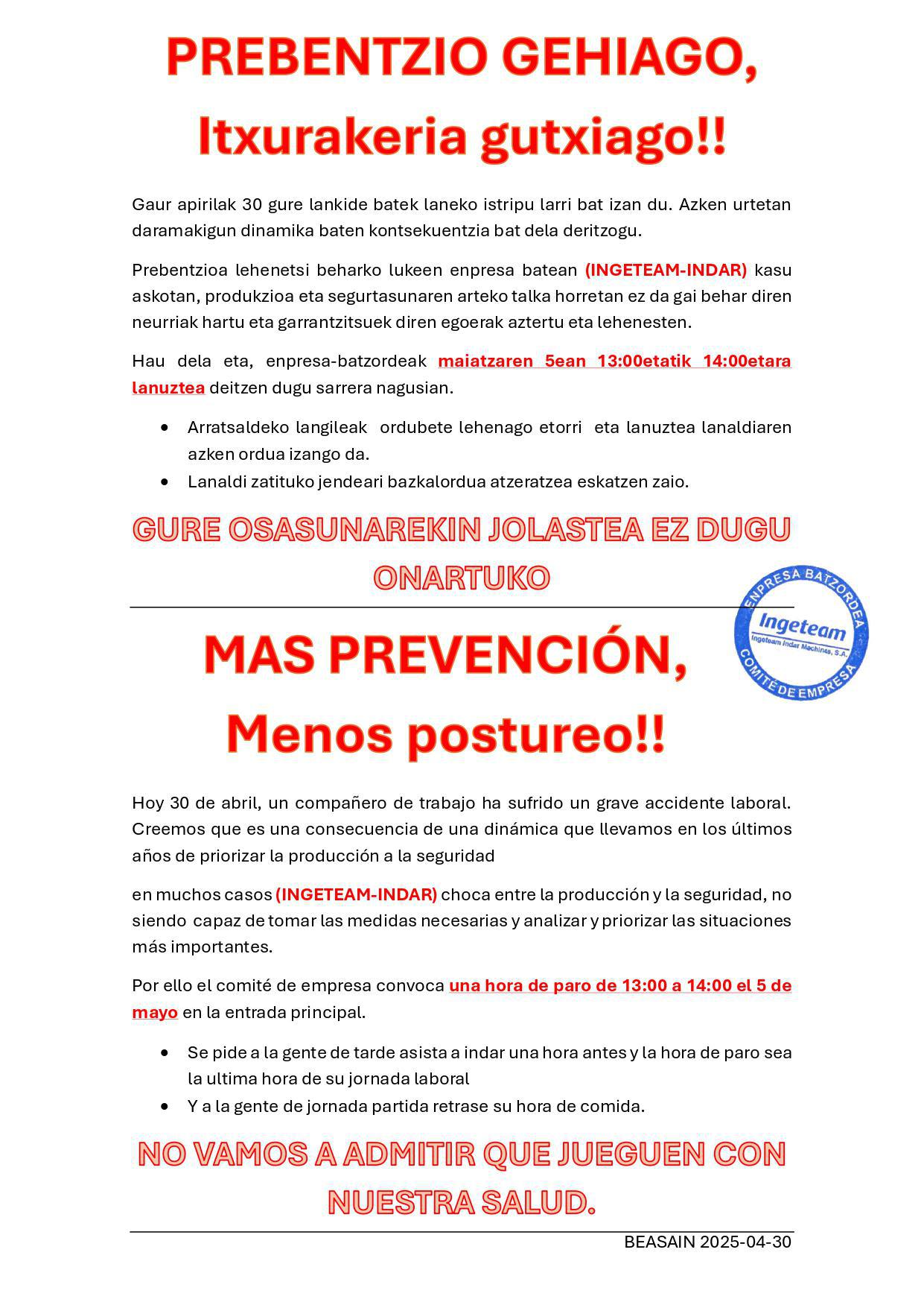 PREBENTZIO GEHIAGO, Itxurakeria gutxiago!! - MAS PREVENCIÓN, Menos postureo!!